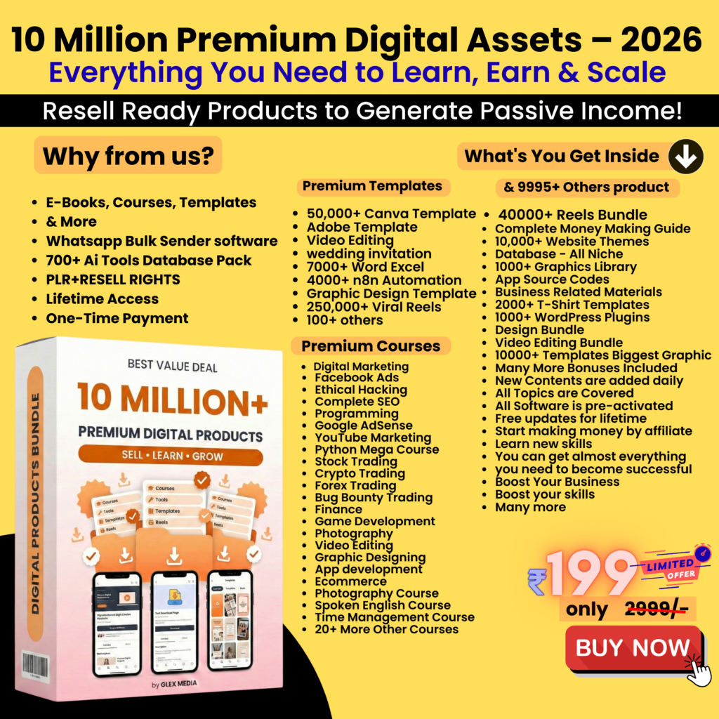 This bundle includes premium courses, eBooks, templates, software, AI tools, marketing kits, social media content, automation tools, and much more. Everything you need to grow your business, enhance your skills, and create passive income.